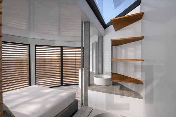 Une ouverture zénithale positionnée au-dessus de la douche permet un apport de lumière naturelle maîtrisé, créant une ambiance intime et lumineuse, de jour comme de nuit.