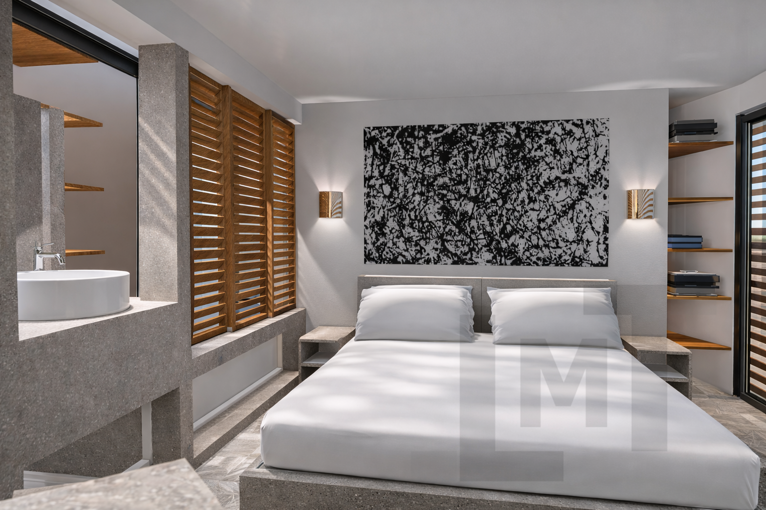 La suite parentale bénéficie d’un accès direct sur l’extérieur et intègre une chambre ainsi qu’une salle de bain attenante, conçue pour optimiser l’espace disponible.