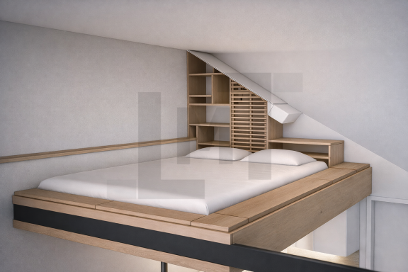 Afin de structurer l’espace vertical et libérer le volume principal, une mezzanine a été créée, offrant un couchage supplémentaire ou un espace de stockage, tout en conservant une hauteur généreuse en partie basse.