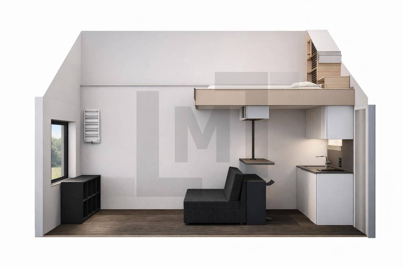 Le reste de la pièce est conçu comme un espace de vie modulable pouvant accueillir différents usages, du séjour au couchage, grâce à un mobilier intégré et des rangements optimisés.