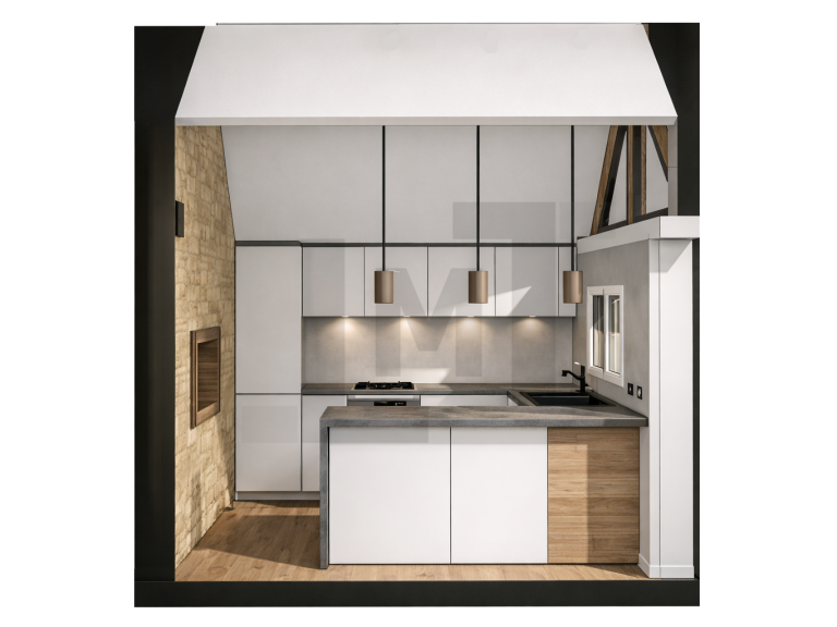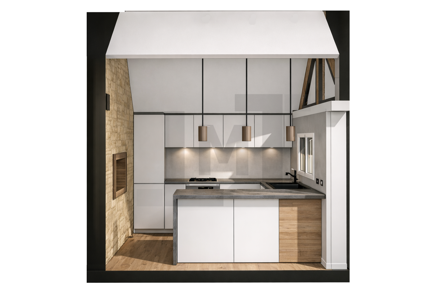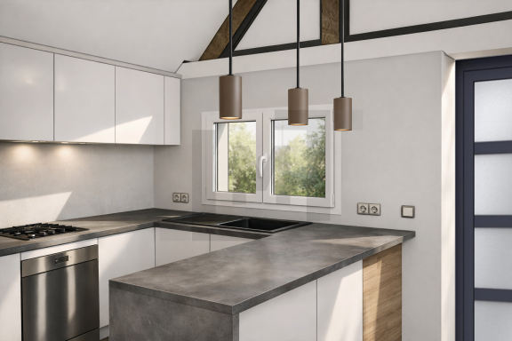 Le projet a été conçu en tenant compte des contraintes techniques existantes, sans modification des réseaux de plomberie ou de gaz, afin de limiter les coûts. L’intervention s’est concentrée sur l’optimisation de l’espace, la lumière naturelle et la mise en valeur du volume sous charpente.