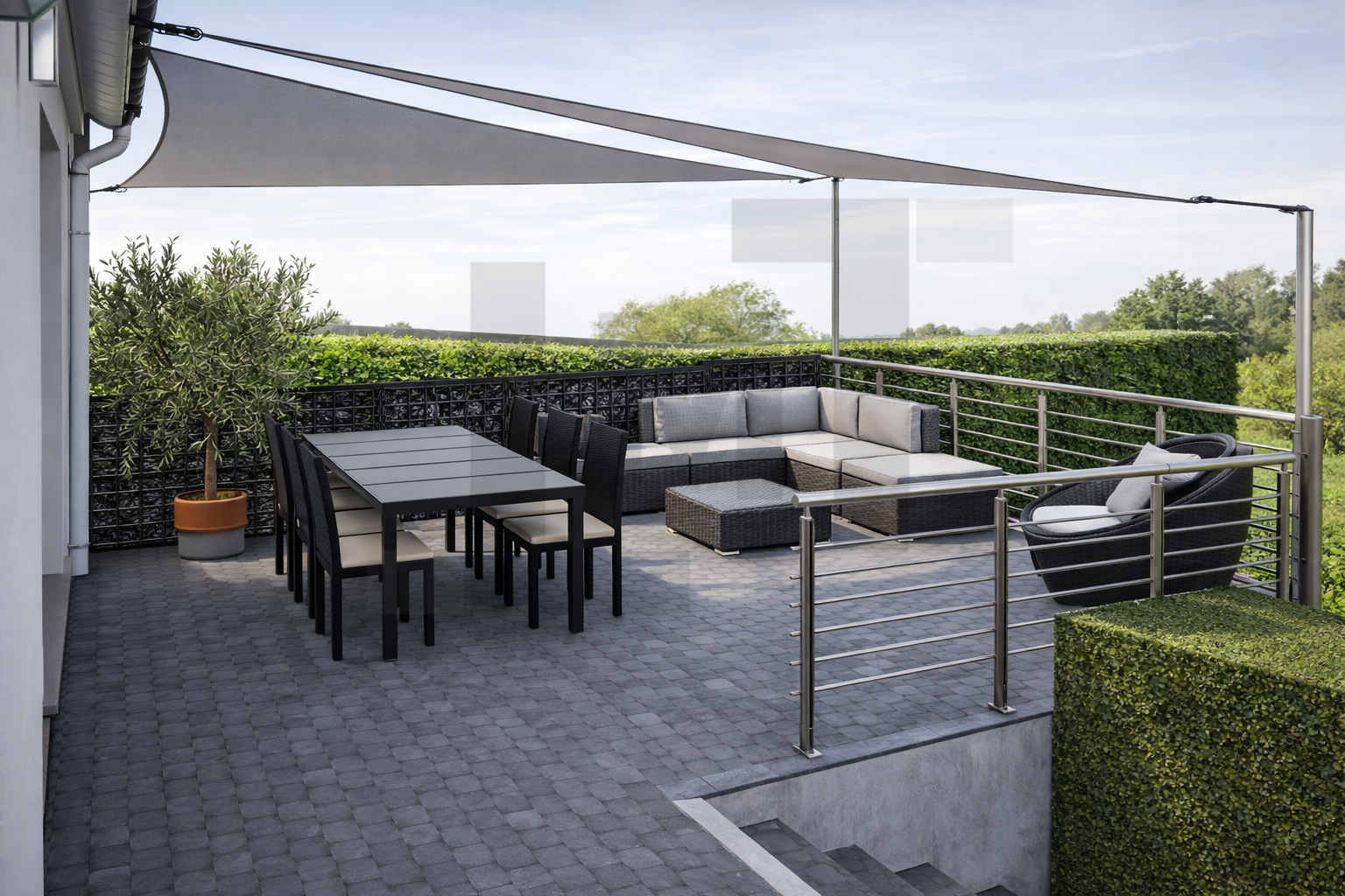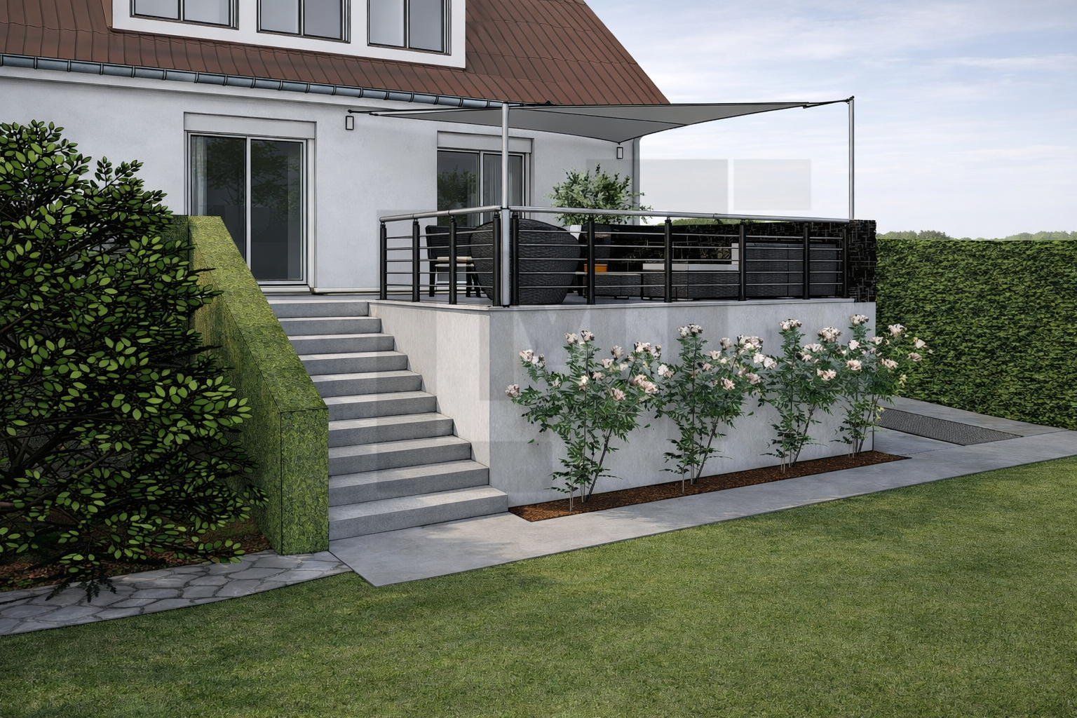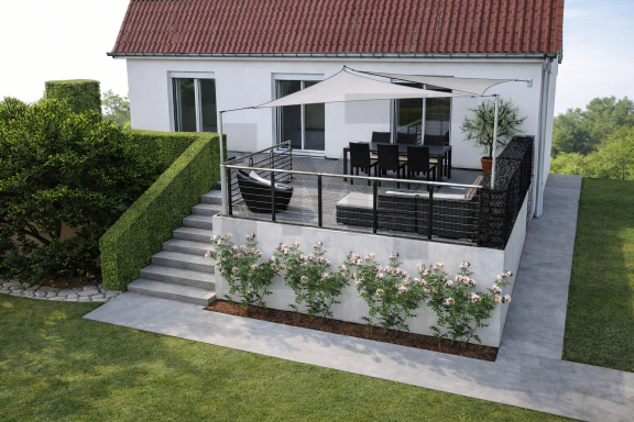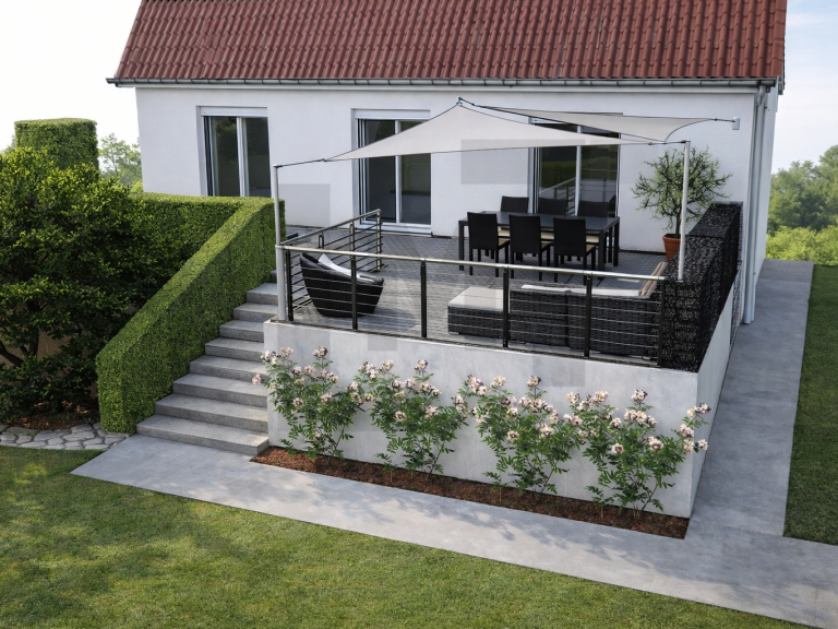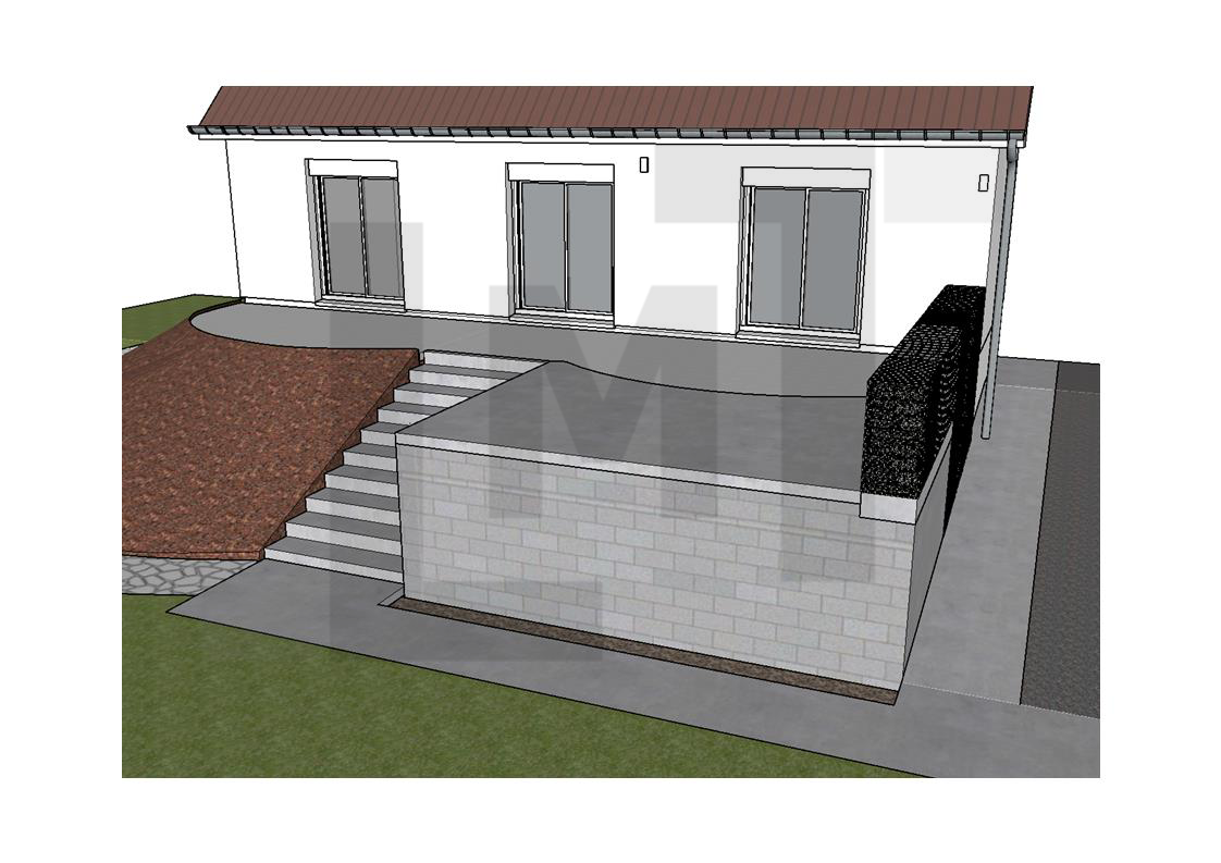La conception propose une réorganisation complète de la terrasse, avec la création d’une nouvelle plateforme permettant d’étendre la surface existante et de structurer plusieurs zones distinctes : espace détente, zone de repas et cuisine extérieure.