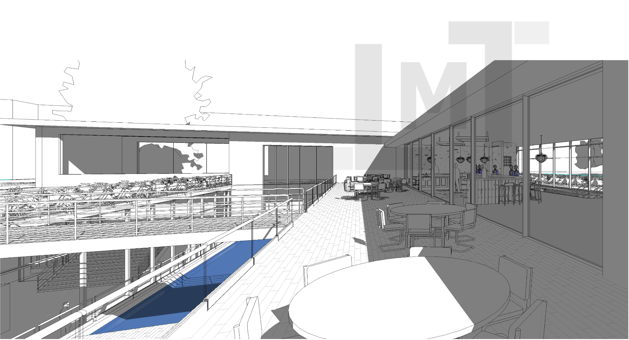 Un bassin creusé en niveau inférieur relie les différents programmes, génère des jeux de niveaux et d’emboîtements dans le sol, tout en assurant un apport important de lumière naturelle aux espaces intérieurs.