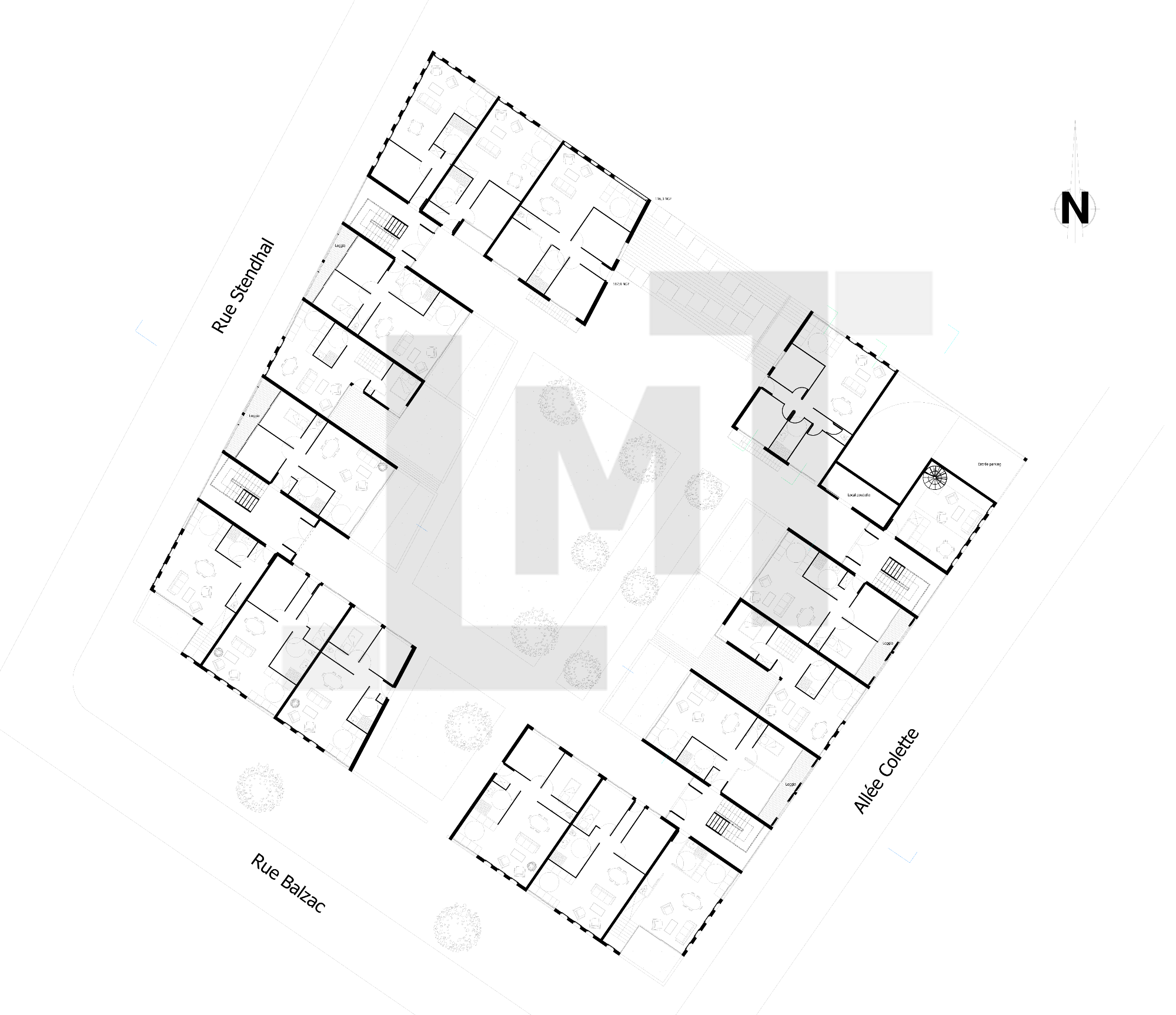 Les logements situés en angle sont traités autour de patios intérieurs, créant des espaces tampons vis-à-vis de la rue, favorisant l’intimité et l’apport de lumière naturelle.