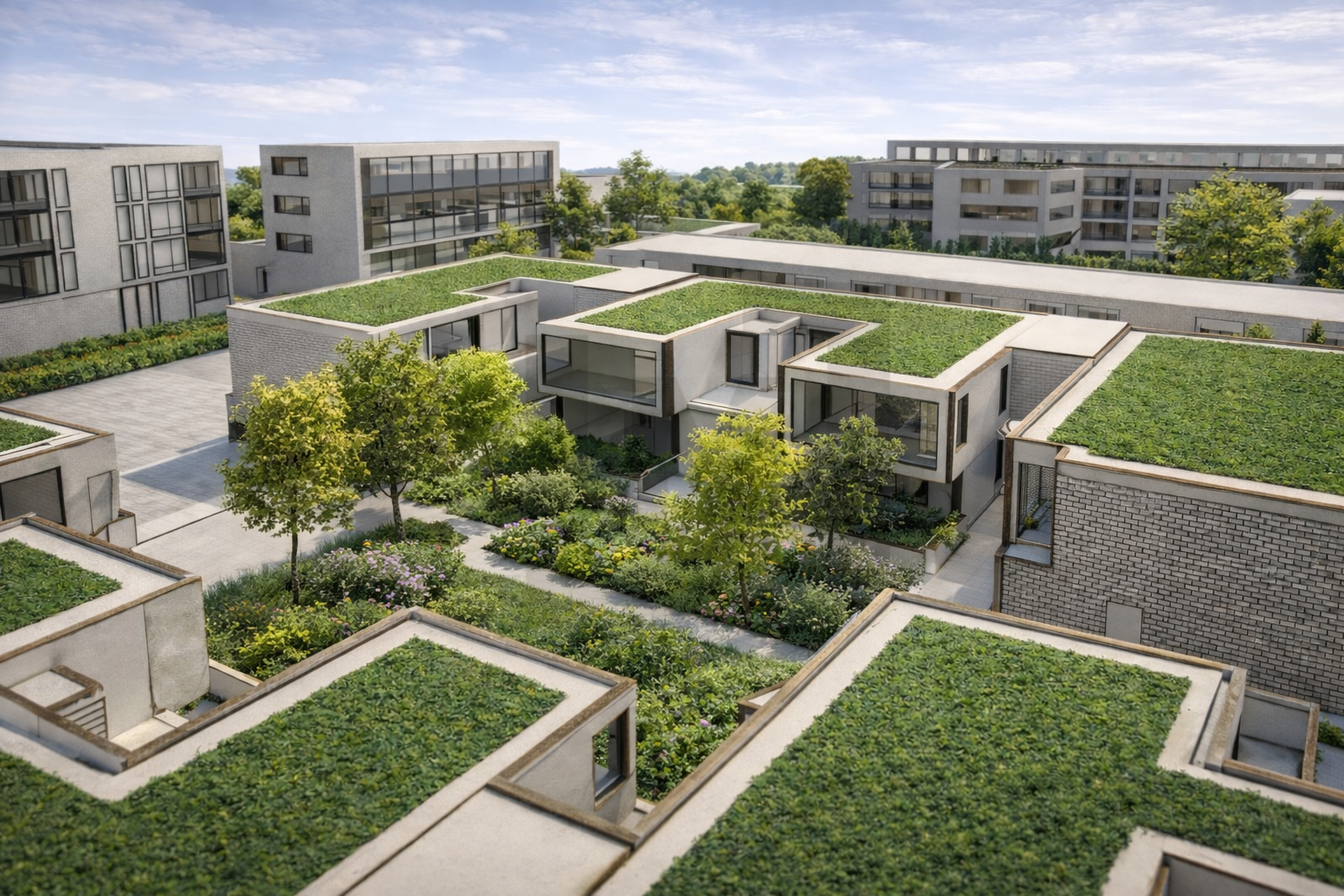 La réflexion architecturale vise à créer une harmonie visuelle à l’échelle urbaine, en lien avec l’axe de circulation principal, notamment par l’alignement des façades sur rue et une homogénéité des matériaux tels que le béton, l’acier Corten, le bois et la brique.