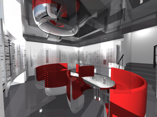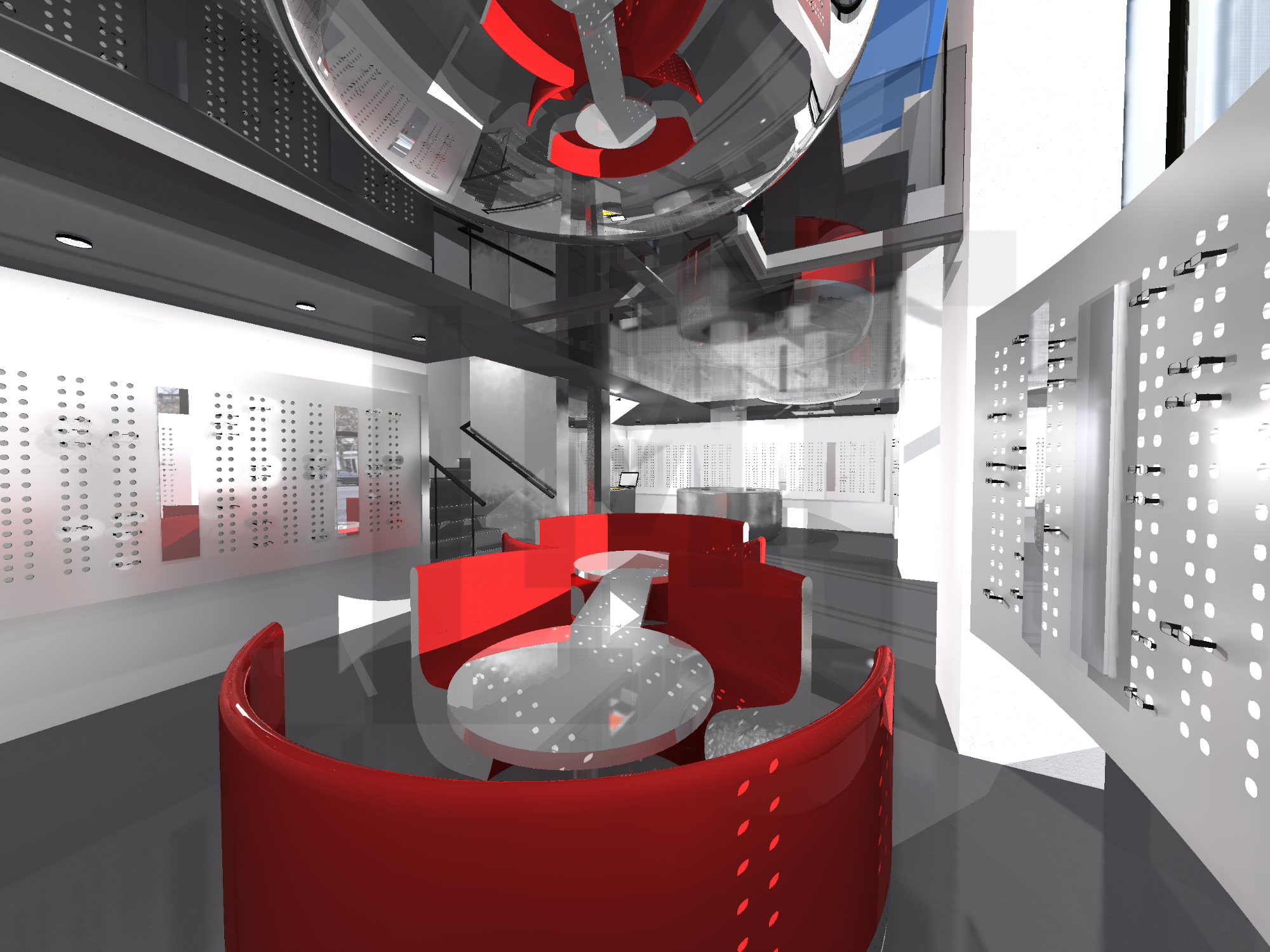 Un élément architectural fort a été imaginé afin de singulariser la boutique : des espaces de vente privés prennent la forme de volumes suspendus, conçus comme des coquilles en une seule pièce, se projetant dans le vide de la double hauteur.